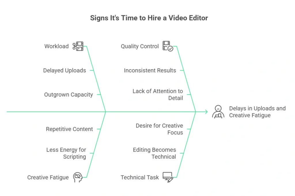 Another common indicator is creative fatigue. When you spend most of your time editing, you often have less energy for scripting, filming, or coming up with new ideas. Content can start to feel repetitive, and experimenting with new ideas gets pushed aside simply because there is no time to execute them properly.